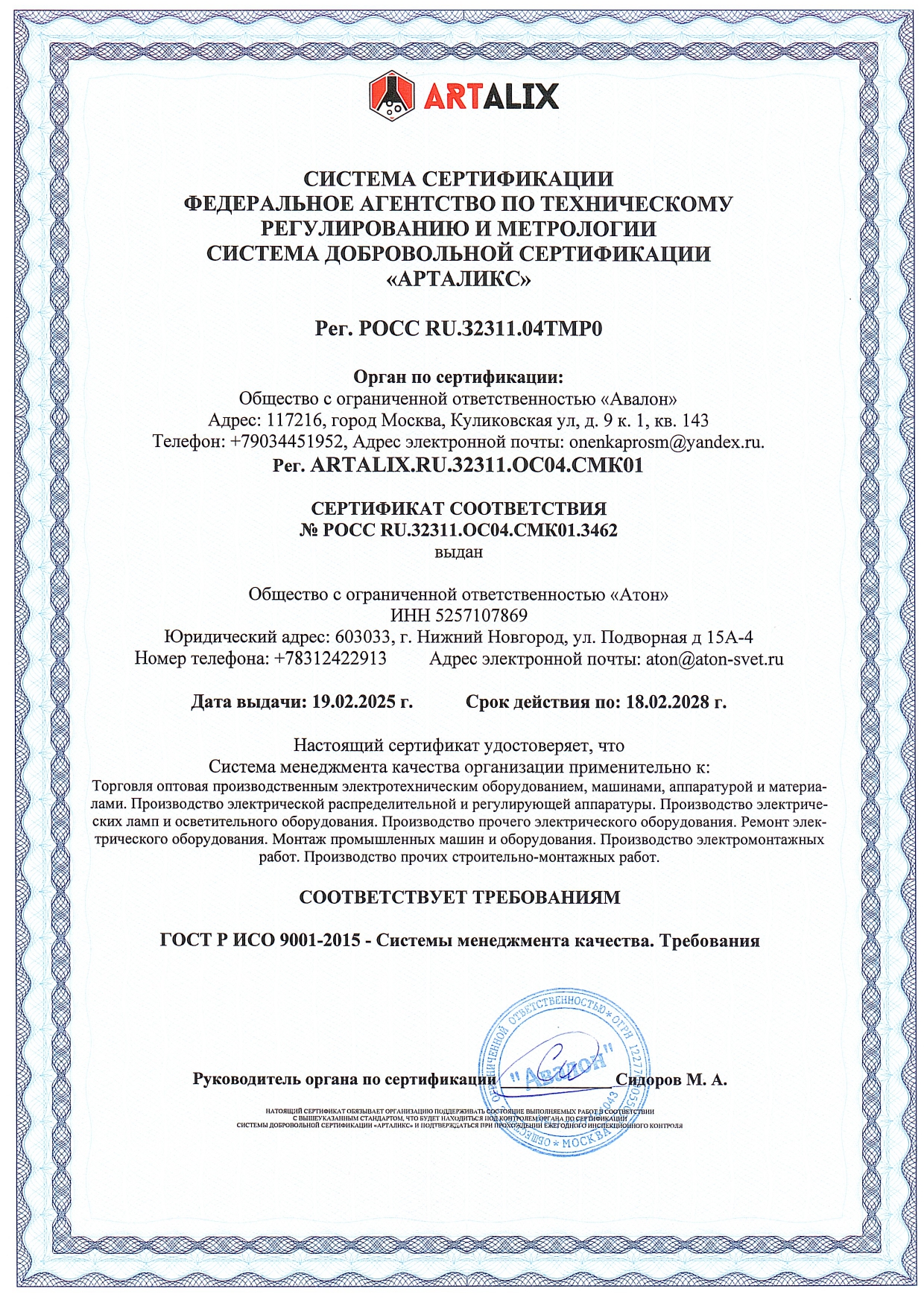 Компания Атон — производитель сертифицированных светодиодных светильников с заводом в Нижнем Новгороде. Мы гарантируем высокое качество продукции, соответствующей всем действующим российским и международным стандартам. Наличие официальных сертификатов — важный фактор при выборе надежного поставщика светодиодного освещения, особенно для оптовых закупок.