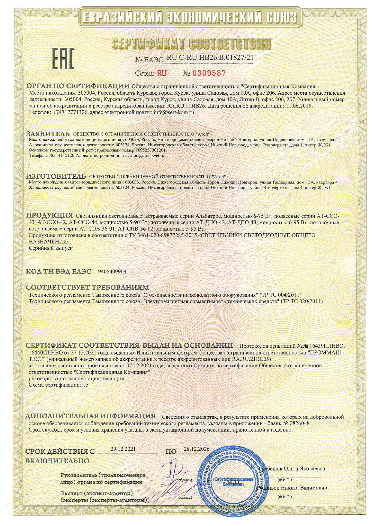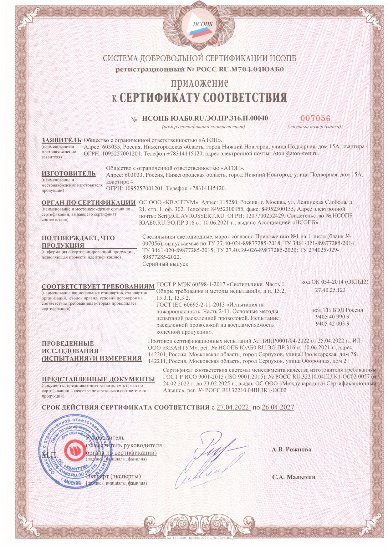 Все светодиодные светильники Атон проходят строгий контроль качества на каждом этапе производства. Мы используем только проверенные материалы и компоненты, что позволяет гарантировать долговечность, энергоэффективность и безопасность продукции. Сертификаты подтверждают соответствие требованиям ГОСТ, Технического регламента Таможенного союза и других нормативных документов.